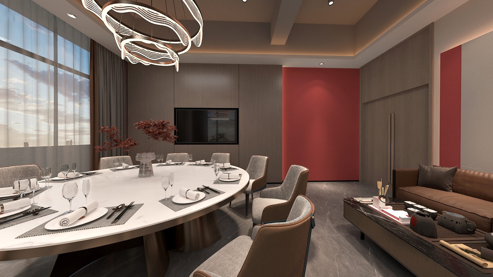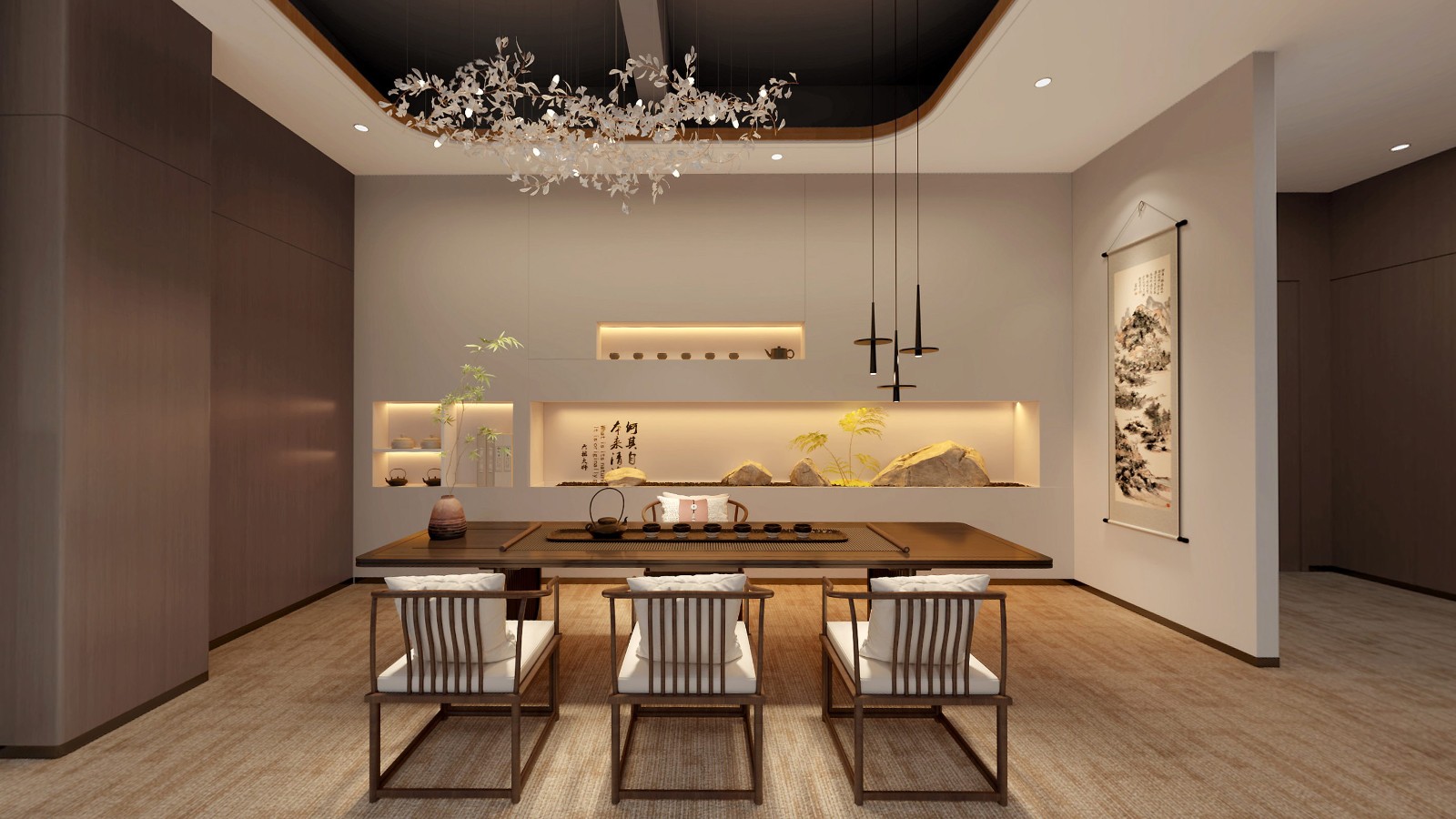 辦公區域延續采用了新中式的設計風格,簡化了繁雜的裝飾,加入了少量的幾何元素進行點綴,為古典文藝的辦公空間融入了商務元素,同時也滿足了現代辦公的功能性和審美需求,創造出一個既典雅又高效的工作環境。
