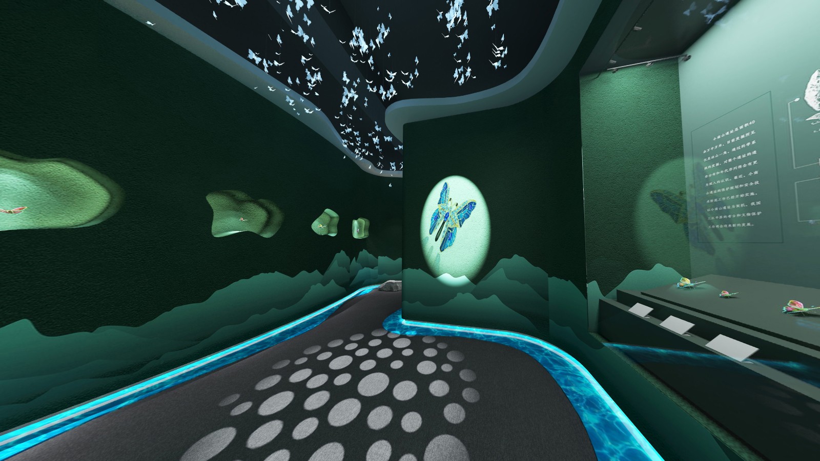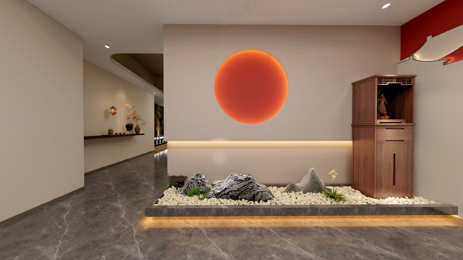 公共區域借鑒中國山水畫的意境,采用了假山、古樹、原石等造物裝飾,將山水美景移進室內,營造出與自然和諧共生的氛圍.為進入展廳做出了鋪墊。