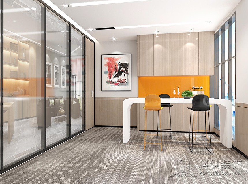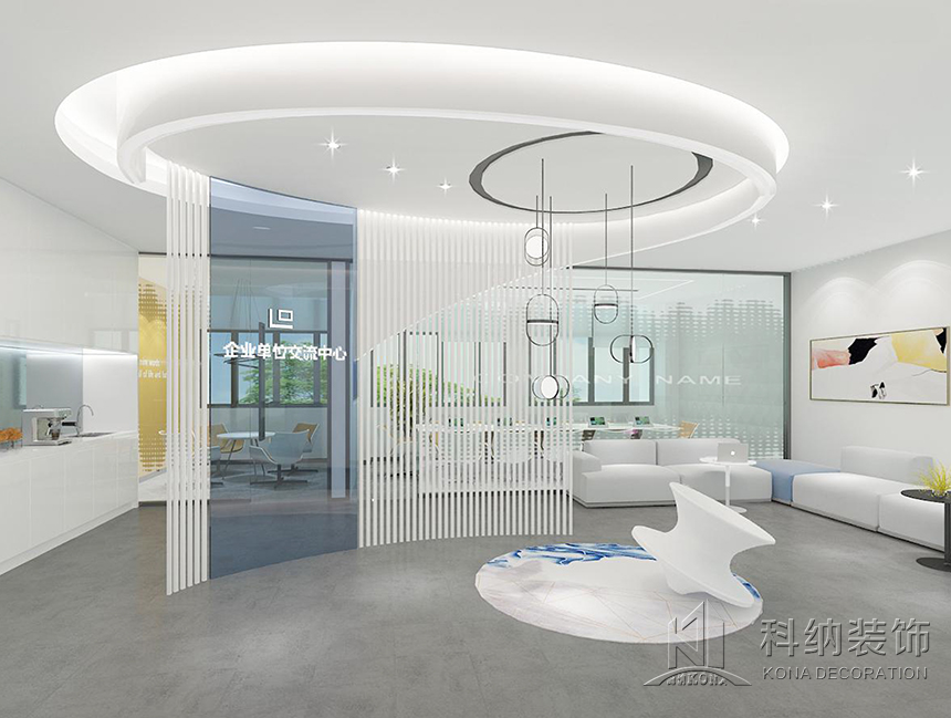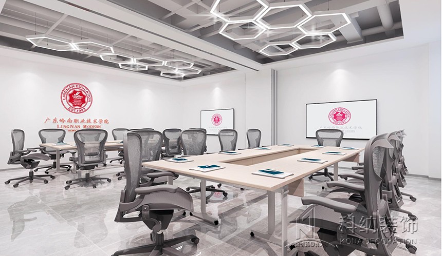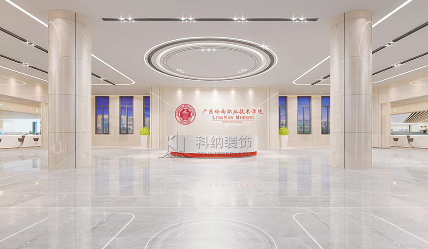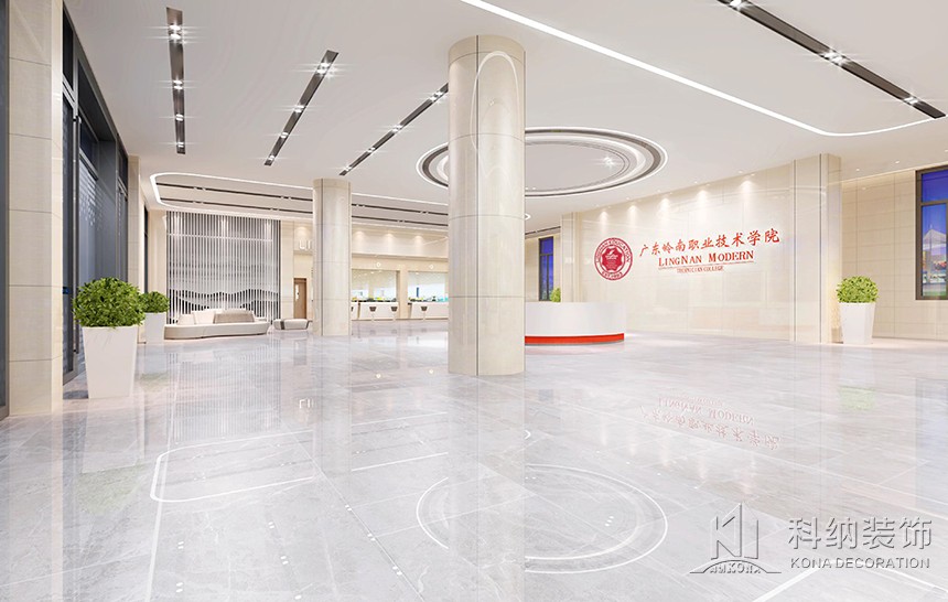 設計理念:該案例是嶺南學院清遠校區行政辦公樓設計裝修項目,為了使行政樓更好地作為服務和辦公場所,設計師根據使用需求將一層設計為多功能綜合服務大廳;二層為校企合作基地,對外辦公;三層作為行政職能辦公室;四層為校領導、核心職能部門辦公室,對內辦公;五層作為會議室和檔案室,用于內部使用。這樣的規劃設計合理,各區域既聯系又互不影響,很好地將校內外人員分流,最大程度地利用全部空間。天花圓形造型與線條組合,構造出“宇宙星空軌跡”,飛機造型吊燈寓意學生以嶺南學院為起點,學有所成,飛向屬于他們各自的領域。墻面以護墻板裝飾,既起到保護墻體的作用,又與整體風格相呼應。