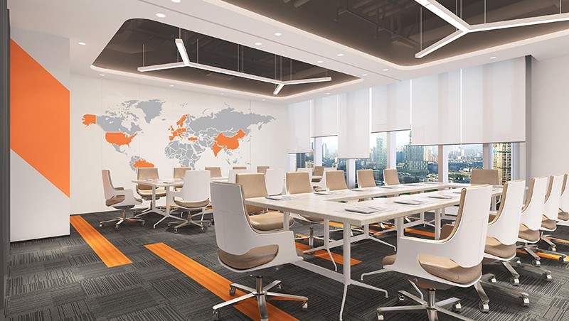 中會議室墻面配以灰色乳膠漆,簡單的圖案豐富空間的層次感,使整個辦公空間色調干凈高雅;白色軟膜天花相結合的造型吊頂,形成快捷明亮舒適的室內空間,這也是辦公室設計的功能要求所決定的。