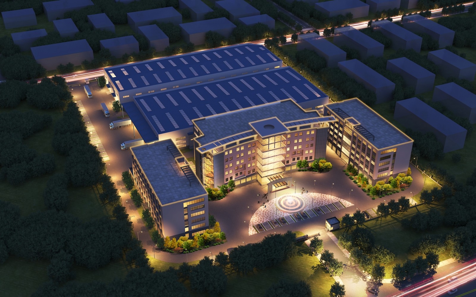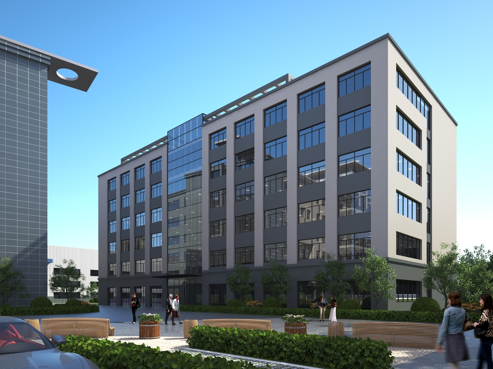 設計理念:廠房單體樓棟呈院落式布局,共同圍合出內部怡人的園區(qū)環(huán)境,在多個不同主題的庭院中,人們可以感受到建筑體量的層次感和空間變化,同時也可以享受到自然光線和景觀的美好,為員工的交流和互動帶來更多流通性和便利性,創(chuàng)造盡可能多的城市性開放綠色空間。